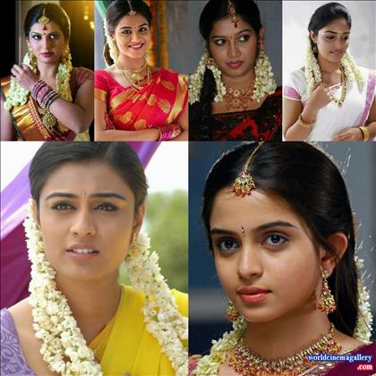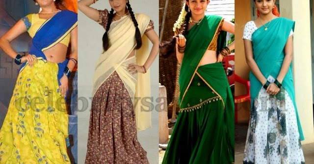 Tamil Actress In Half Saree : Preethi sharma wearing half saree with a blend of vibrant colours along with puffy sleeves, unembellished jewels.